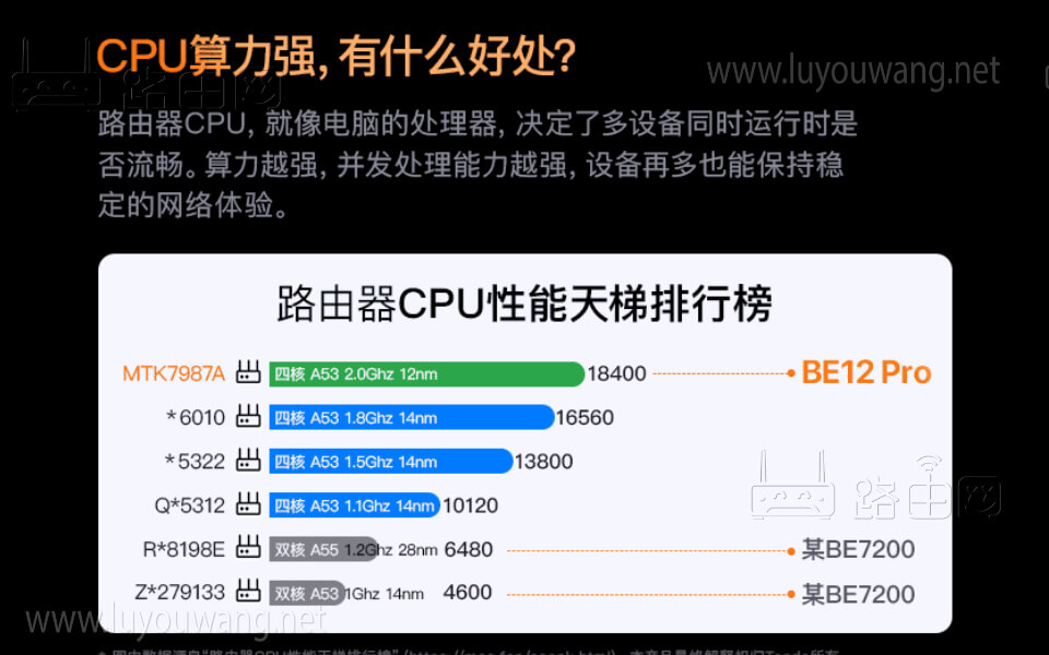 CPU采用MT7987A,MT7987A是联发科推出的Wi-Fi 7网络处理器,采用四核Arm Cortex-A53架构,主频2.0GHz。