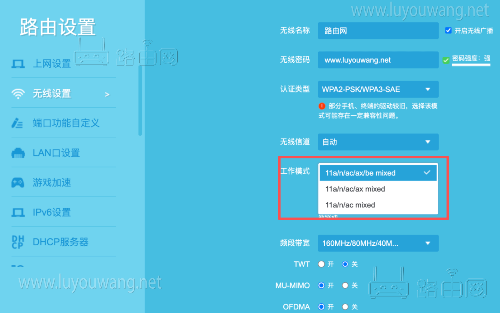 打开路由器管理后台,在管理后台界面找到「无线设置」或者「WiFi设置」,将路由器的无线WiFi模式选为:11a/n/ac/ax/be mixed,带有be即为WiFi7模式。