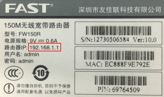 通过查看FAST路由器底部铭牌标签得到该路由器正确的管理页面地址。