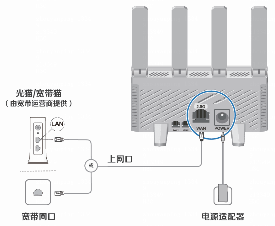 将路由器与入户宽带或者光猫正确的连接,入户宽带或者光猫的网线连接到路由器的WAN网口,路由器的LAN网口网线连接到电脑。