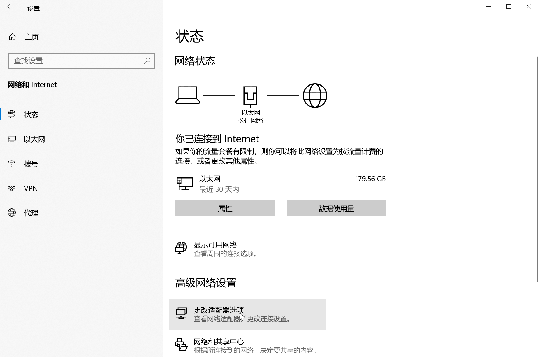 ,选择“网络和Internet设置”。 - 单击“更改适配器选项”,打开网络连接窗口。