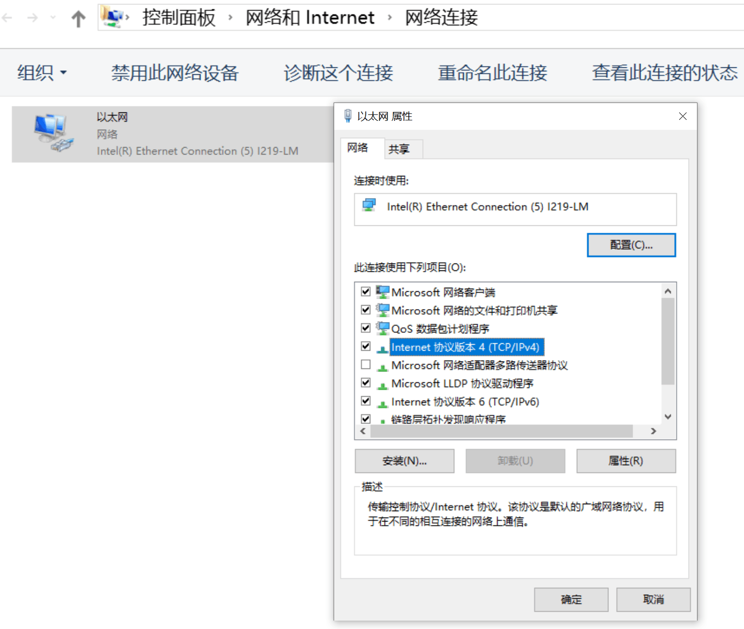 - 右键单击以太网的<属性>按钮,打开“以太网属性”窗口。双击“Internet协议版本4(TCP/IPv4)”