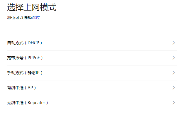 - 设备将自动检测网络环境,推荐合适的上网模式。您也可以手动选择对应上网模式:自动方式(DHCP)、宽带拨号(PPPoE)、手动方式(静态IP)、有线中继(AP)、无线中继(Repeater)。