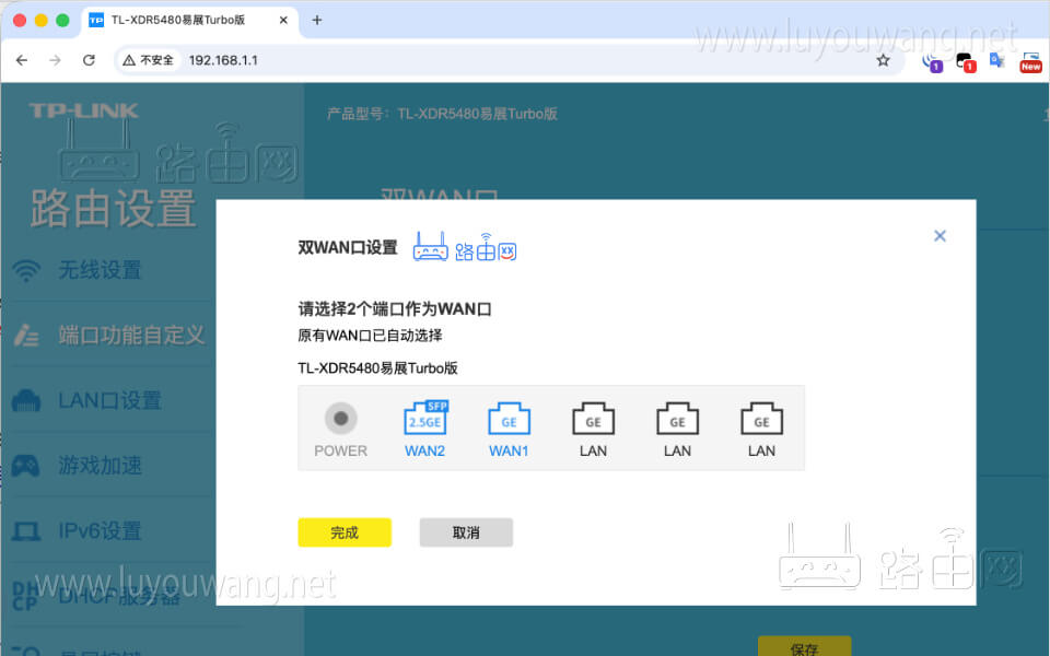 注意:请记住你的选的这两个WAN口,入口宽带要插入到路由器这两个网口做为WAN口拨号。