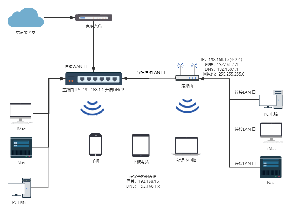 而所谓的「旁路网关」,是指挂靠在主路由网络下的一个旁系网络,他分担了一部分路由器的功能,因此被大众简称为「旁路由」,本质上它是一个通过 LAN 口与主路由连接的一个客户端设备。