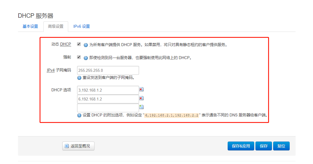 - 在「DHCP 服务器」设置中,「IPv4 子网掩码」设置为 「255.255.255.0」,「DHCP选项」 分别填写「3,192.168.1.x」与「 6,192.168.1.x」(IP 地址为你旁路由的 IP 地址)