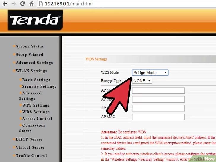 进入无线设置页面,找到“网络模式”、“无线模式”或“连接类型”选项,将其设置为“桥接模式”或“中继模式”。[3]如果你没有找到相关选项,那么你的路由器很可能不支持桥接功能。