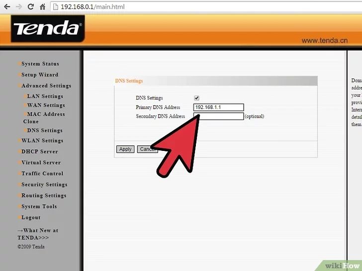 打开配置页面。如果你选择创建LAN-to-LAN网络,请将IP地址最后一位数字加一,使之与主路由器匹配(例如将192.168.1.1更改为192.168.1.2)。如果你选择创建LAN-to-WAN网络,请将IP地址倒数第二位数字加一,使之与主路由器匹配(例如将192.168.1.1更改为192.168.2.1)。此外,请设置辅助路由器的子网掩码,使其与主路由器相同。