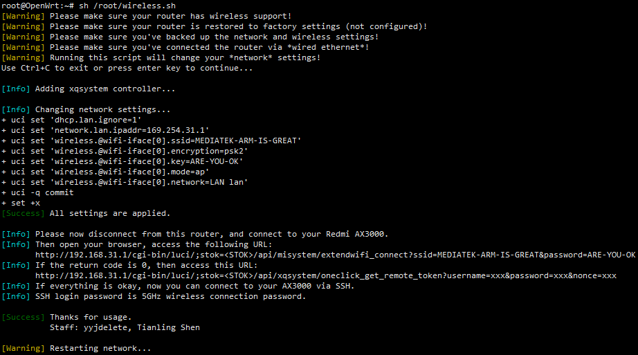 警告: 执行本脚本会更改您的网络和无线设定,执行之前请务必备份相关数据