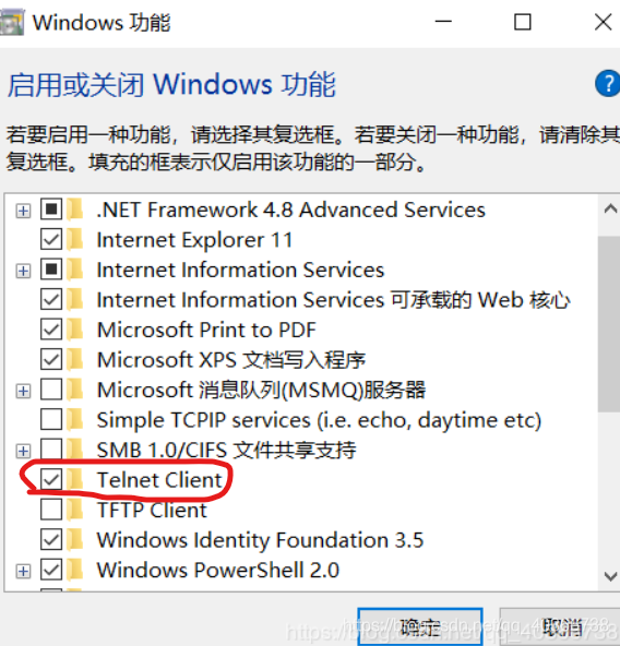 或使用方法2:打开控制面板 -> 打开程序和功能 -> 启用或关闭windows服务 -> 打开Telnet Client