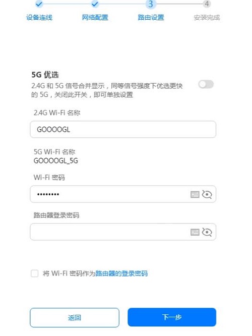 由于此华为路由器是双频信号,你需要同时设置2个WIFI名称和密码,底部的勾选管理密码可以将登录密码与WIFI密码设置相同。