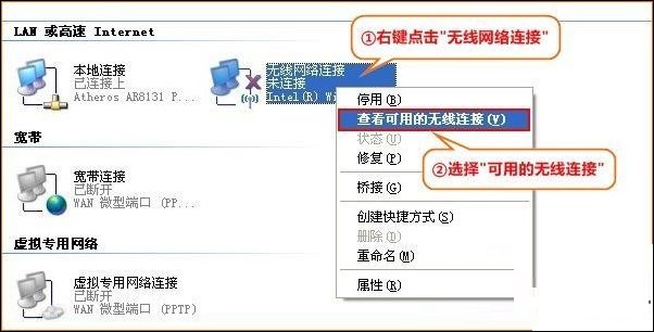 1、右键点击“无线网络连接”—— 选择“查看可用的无线连接”。