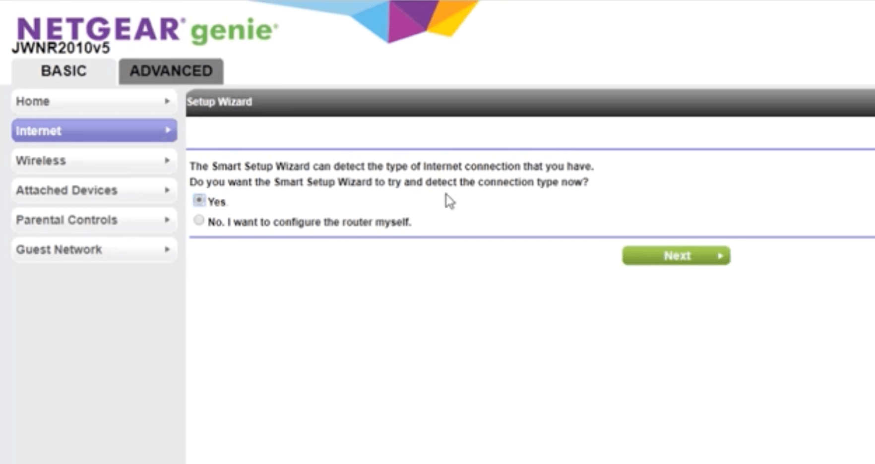 4. 登录后,从“设置向导”>“新建连接”>菜单转到“Internet”,然后按照 NETGEAR Genie 配置路由器。