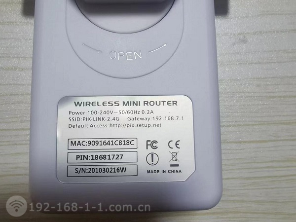 路由器背面贴纸说明;(显示 PIX-LINK 无线扩展器登录地址为:192.168.7.1)。