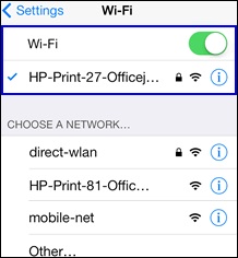 3;在移动设备上,点击设置> Wi-Fi,然后从可用网络列表中选择HP-Print-xx- [您的打印机型号名称]。
