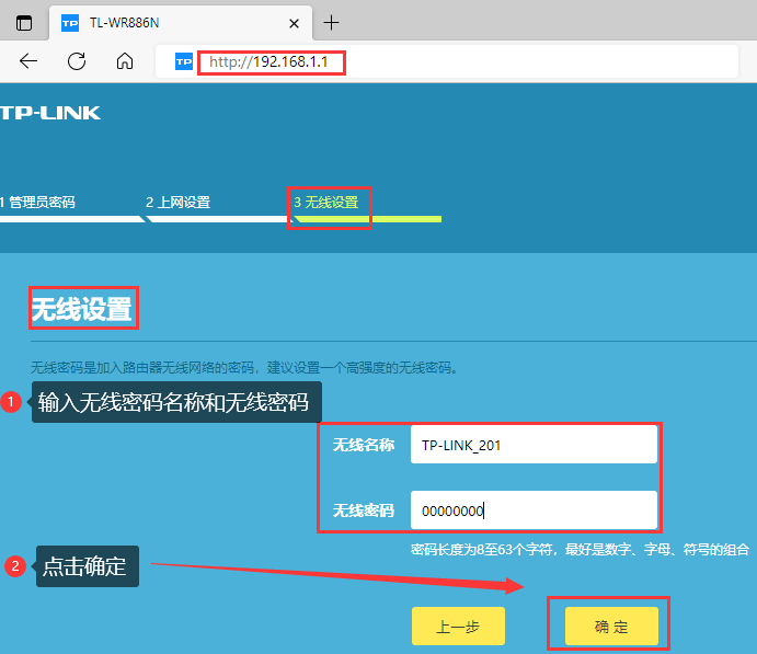 第四步:输入路由器无线密码和无线名称。,然后点击确定。