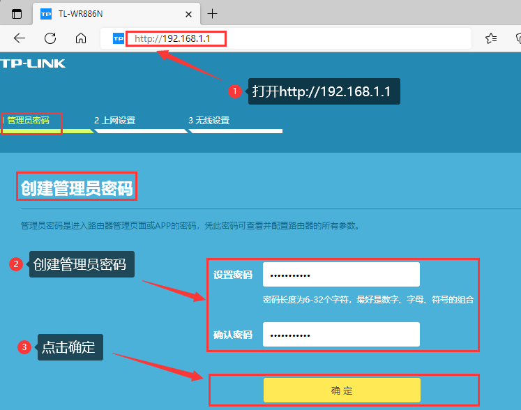 第一步:浏览器输入http://192.168.1.1,打开192.168.1.1登录页面,然后创建192.168.1.1管理员密码,点击确定。