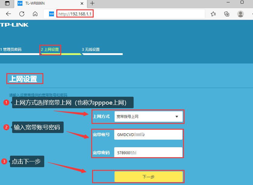 第三步:选择上网方式为宽带拨号上网(也称为PPPOE上网),输入宽带账号和密码,点击下一步。