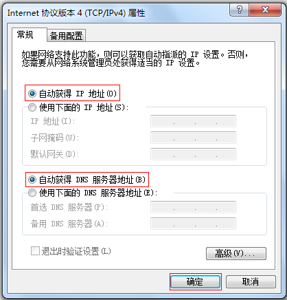 在窗口中选择“自动获得IP地址”选项,并点击窗口底部的“确定”按钮就可以了。