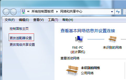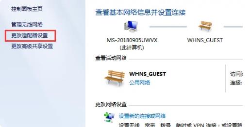 在网络和共享中心页面,在页面左上方找到“更改适配器设置”选项,点击该选项即可