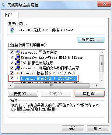 4、找到并点击“Internet协议版本4(TCP/IPv4)”,点击“属性”。如下图所示: