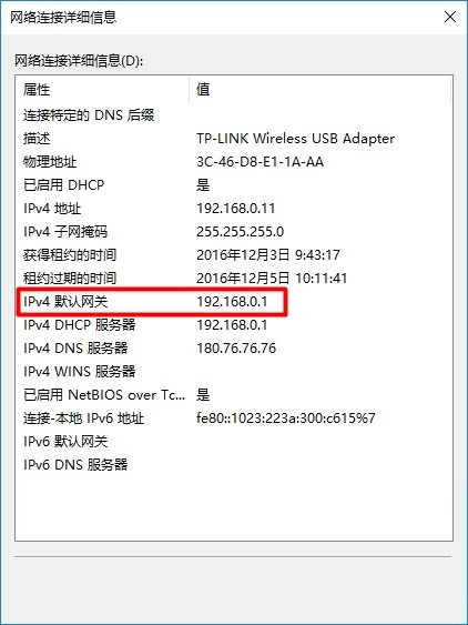 在默认网关旁边,将会列出路由器的IP地址。