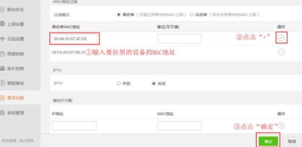2;找到侧栏【更多功能】—【MAC地址过滤】,过滤模式选择黑名单或白名单