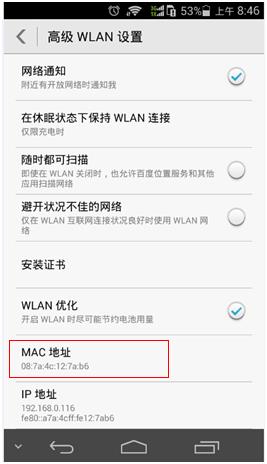 打开无线网络,点击已连接的无线,选择高级;即可查看网关和MAC地址