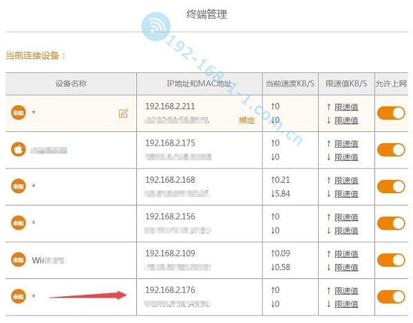 在终端管理的当前设备列表菜单中,可以查看到所有连接到路由器的设备。包括你的打印机设备IP地址也在其中。