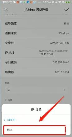 3;点击高级,然后点击IP 设置框并切换到静态而不是默认的DHCP设置。