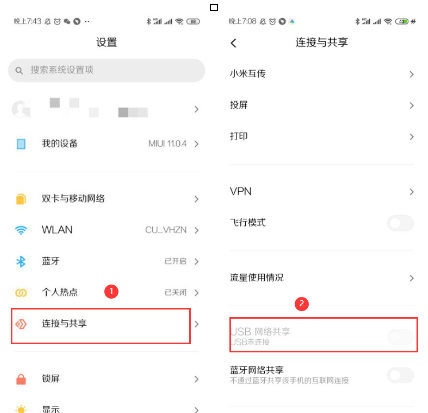 1,小米手机设置,将手机数据线连接上电脑的USB接口,在手机界面上找到设置,之后选择“连接与共享”,进入之后,在选择USB网络共享;