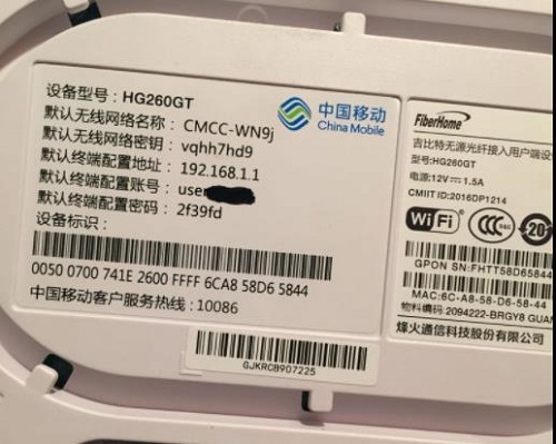 翻转光猫,查看其背面贴纸标签上的信息,会包含IP地址、用户名、密码,无线网络等信息。