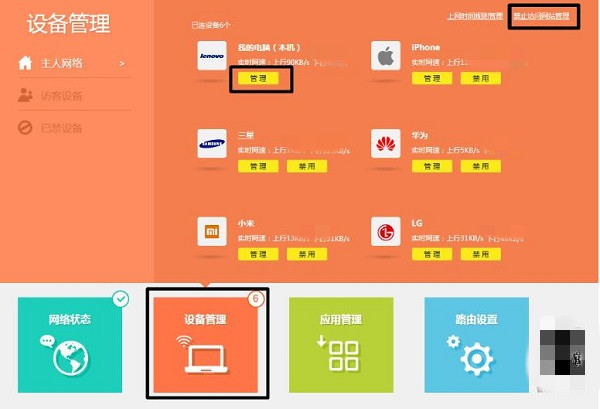 第 3 步:在路由器界面中,点击【设备管理】工具,找到右上角的【禁止访问网站管理】。