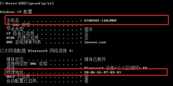 3. 查找要查找其MAC地址的设备的“物理地址”。