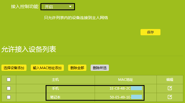 注意:传统界面的路由器,在无线设置>无线MAC地址过滤,启用过滤,过滤规则选择允许列表中生效的MAC地址访问本无线网络,并添加仅允许接入无线网络的无线设备。