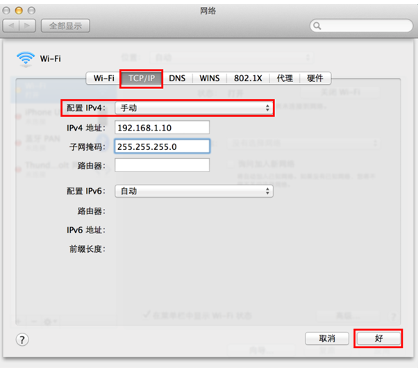 Mac OS系统无线网卡手动指定IP地址的设置步骤如下:
