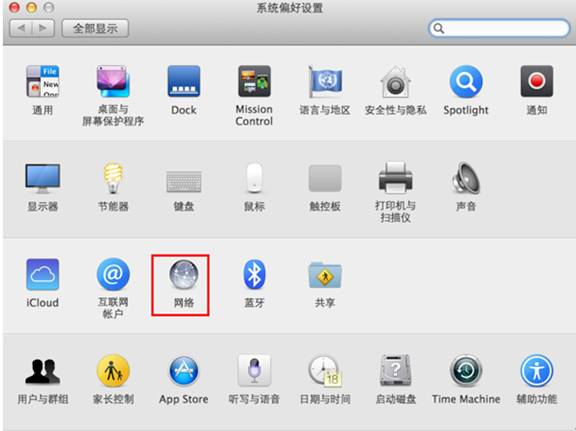 第二步:在系统偏好设置界面中,找到并点击网络。如下图所示:
