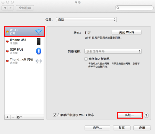 第三步:在网络设置界面中找到并点击Wi-Fi,再点击高级。如下图所示:
