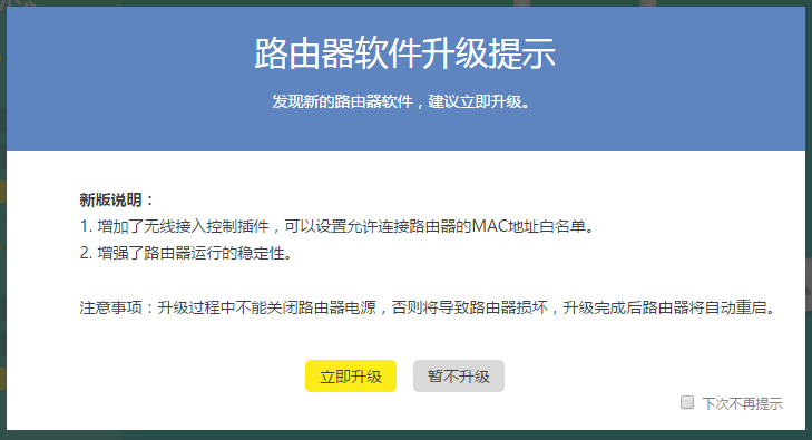 软件升级的目的是增强路由器的稳定性、优化相关功能或增加某些功能。如果在管理云路由器时收到软件升级提示,建议您对路由器进行升级。提示如下: