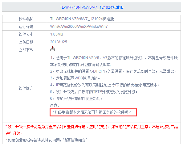 2、路由器的当前软件版本更新或增加的内容较多,无法降级。如果不能降级,我们会在升级包的软件简介中说明,如下图: