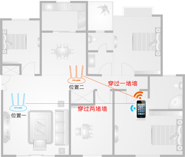 1、尽量选择房屋结构的中央位置,使终端在各个位置接收信号时穿过最少的墙面。如下图: