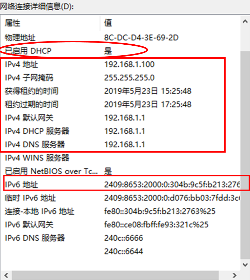 在详细信息的列表中确认已开启DHCP为“是”,并且可以获取到IPv6全球地址,则说明宽带支持IPv6,如下图:
