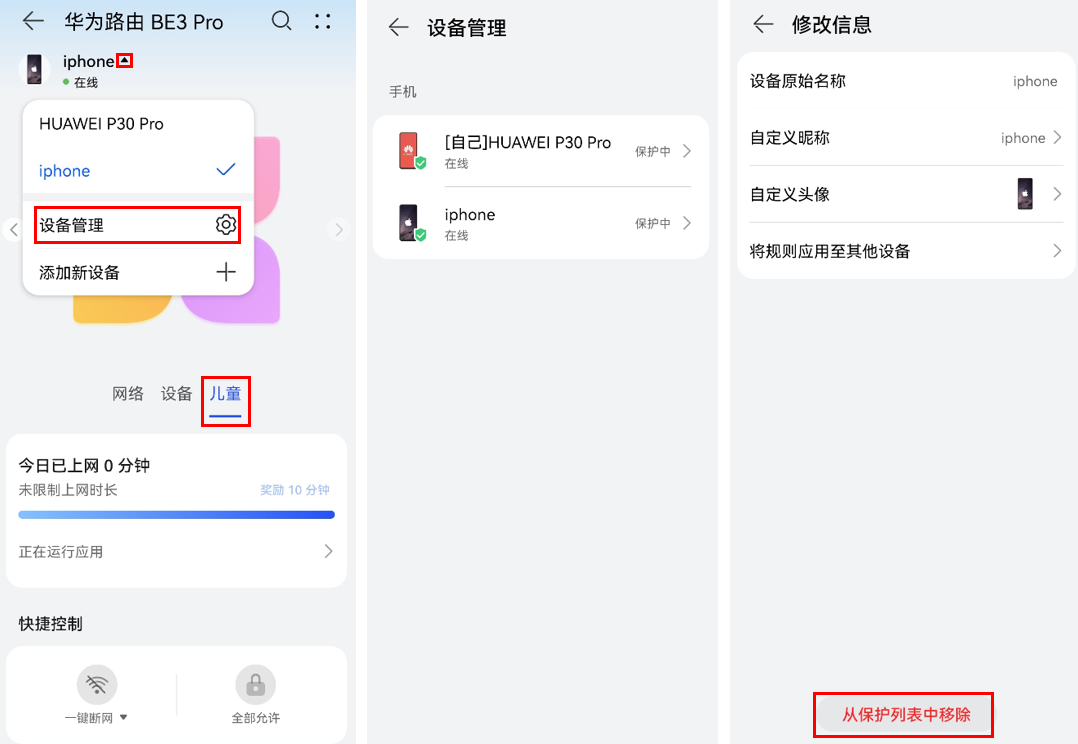 2. 点击儿童,查看不能上网的无线设备是否被设置了儿童上网。若是,点击设备旁的按钮,点击设备管理,选择要删除的设备,点击从保护列表中移除,重新尝试是否可以上网。