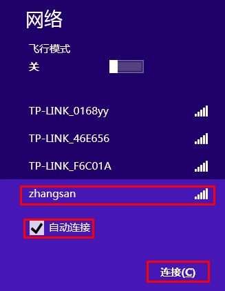 点击电脑右下角的网络图标,在打开的信号列表中找到并选择自己的无线信号zhangsan(勾选自动连接),点击连接。如下图所示: