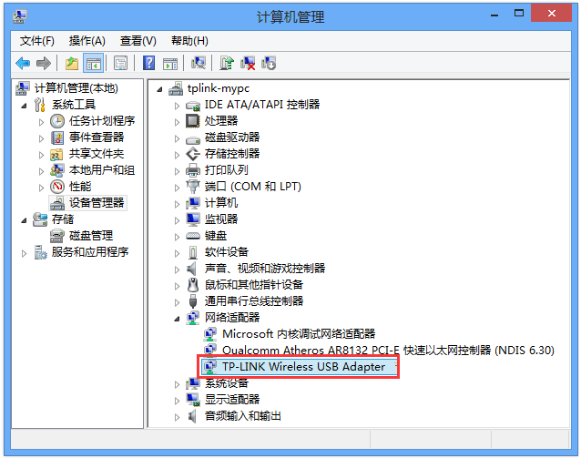 [3]点击设备管理器>网络适配器,看到无线网卡图标上没有黄色叹号或问号,说明网卡已经被正常识别。如下图: