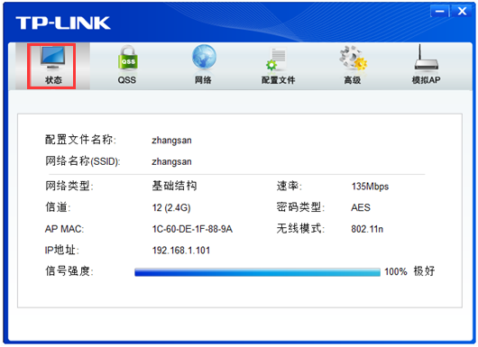 成功连接之后,点击状态,可以看到无线信号基本信息以及获取的IP地址。如下: