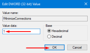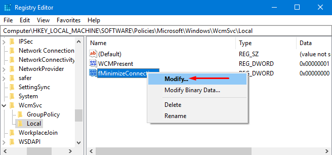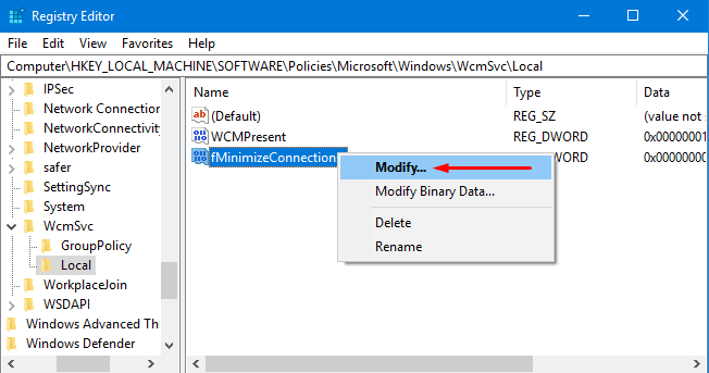 5. 将此新生成的 DWORD 命名为fMinimizeConnection。右键单击它,然后从几个选项列表中选择修改。