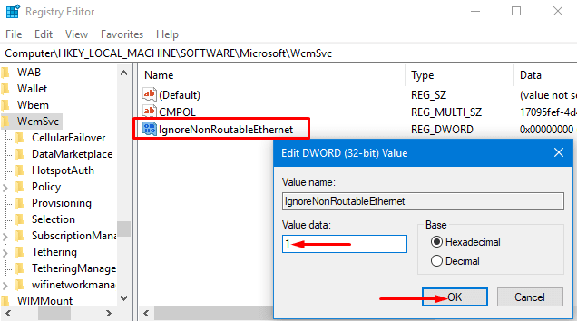 9. 将此 DWORD 命名为IgnoreNonRoutableEthernet,然后双击它。