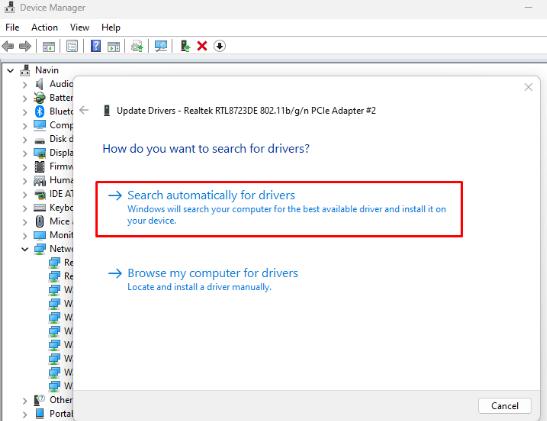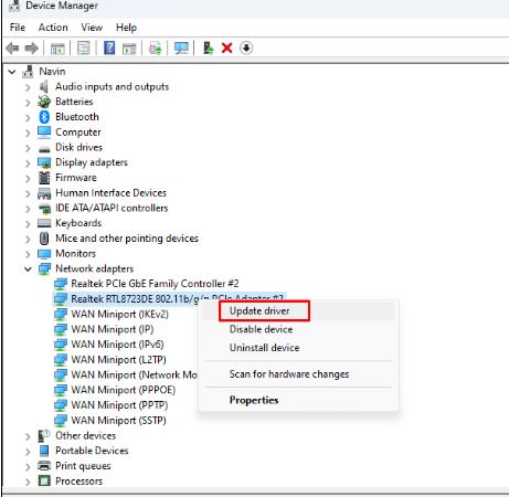 在Win11或win10中更新 WiFi 驱动程序的另一种简单方法是通过“设备管理器”,并按照给定的步骤顺序进行操作。
