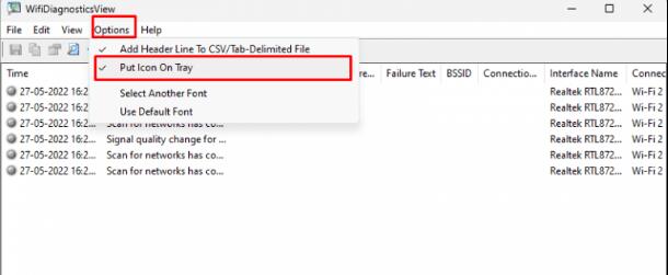 7. 启用此选项后,关闭主窗口。该实用程序将继续在后台监控您的 Wifi 连接。只需双击系统托盘中的图标即可启动 WifiDiagnosticsView。